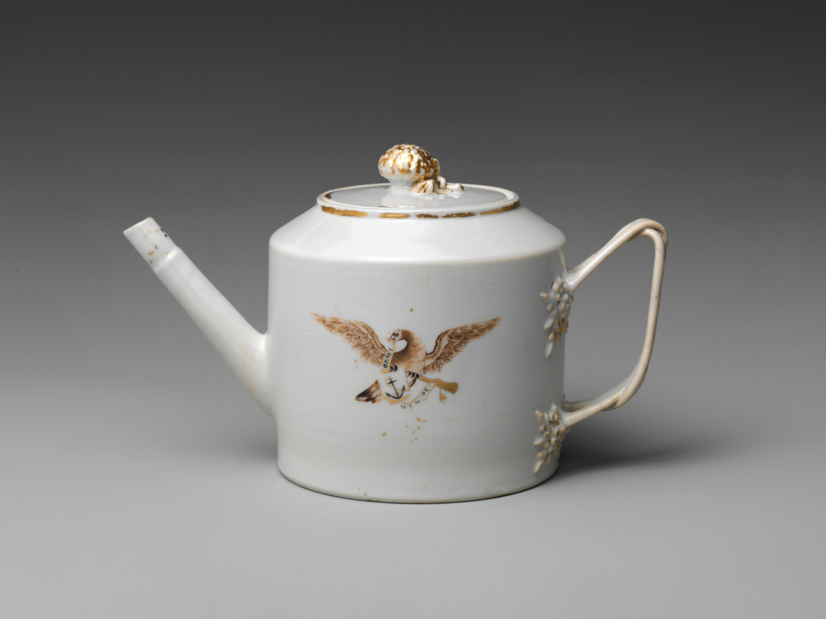 For the first fifteen years of their seafaring lives, the Independence and Constitution hosted an unprecedented display of historic treasures that proved quite popular with passengers.11 Forty-eight objects were loaned to the Independence, and forty-five to the Constitution, all either made for the American market or manufactured in American workshops between the mid-eighteenth and late nineteenth centuries. Chief among the loans were two silver objects made by Paul Revere: a cann (listed as a mug) was selected for the Independence and a porringer for the Constitution (fig. 3). The inclusion of these objects was an impressive accomplishment for Dreyfuss, as Revere had been a major figure among American folk heroes since the 1870s, helped by Henry Wadsworth Longfellow’s 1860 poem. His name alone caught the attention of audiences, even if they had little familiarity with decorative arts.12 Although Revere was the most recognizable name among the craftspersons exhibited on board, other represented silversmiths included William Cowell, John Hasiter, Myer Myers, Joseph Richardson, Samuel Vernon, and Daniel Van Voorhis.13 Ceramics accounted for over half of the loan objects. Each item was chosen either for its patriotic decoration or for its unusual form. Most of the objects were manufactured in Staffordshire or Liverpool for the US market—with a few examples of Chinese export porcelain included for good measure. The rest of the ceramic objects originated from North America. The variety of objects displayed on each vessel was largely similar, although the Independence exclusively received several figurines of animals and people, while the Constitution displayed several examples of Pennsylvania slipware. Likewise, the glassware loaned for the displays consisted of representative examples of various antique forms, including whale oil lamps, molded-glass flasks displaying patriotic iconography, and various glasses and drinking vessels.14