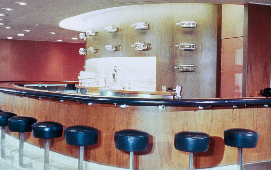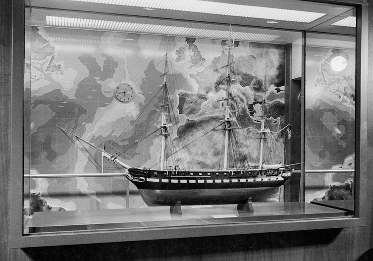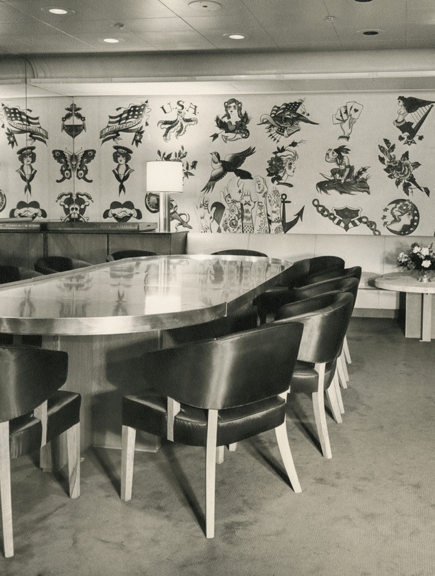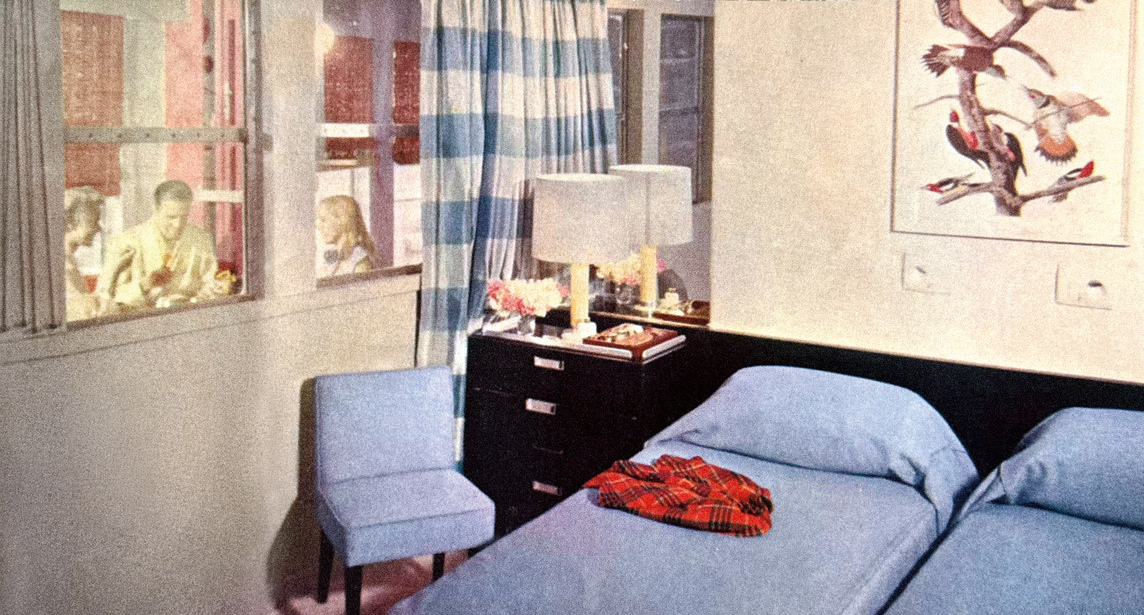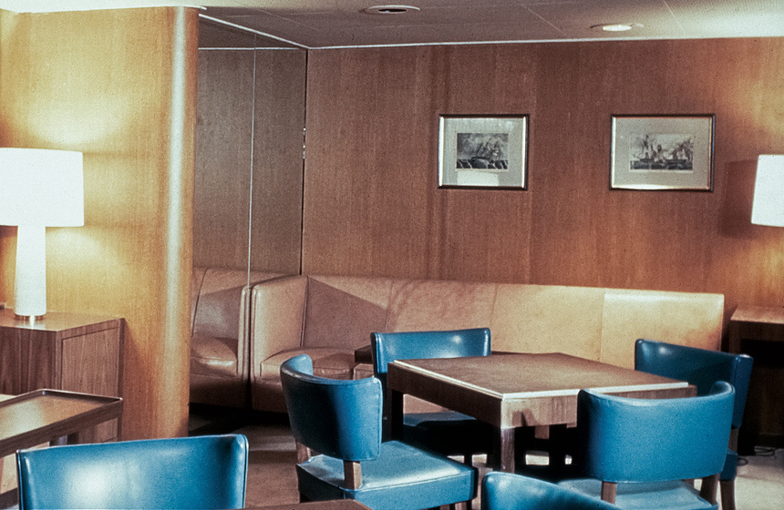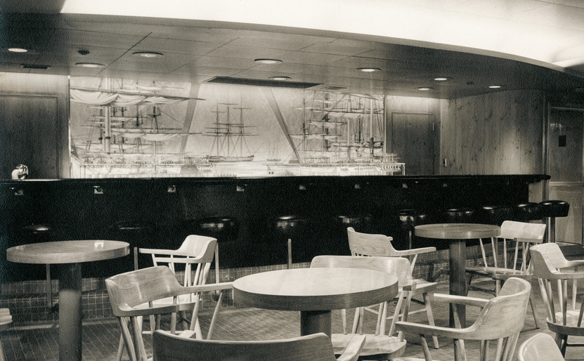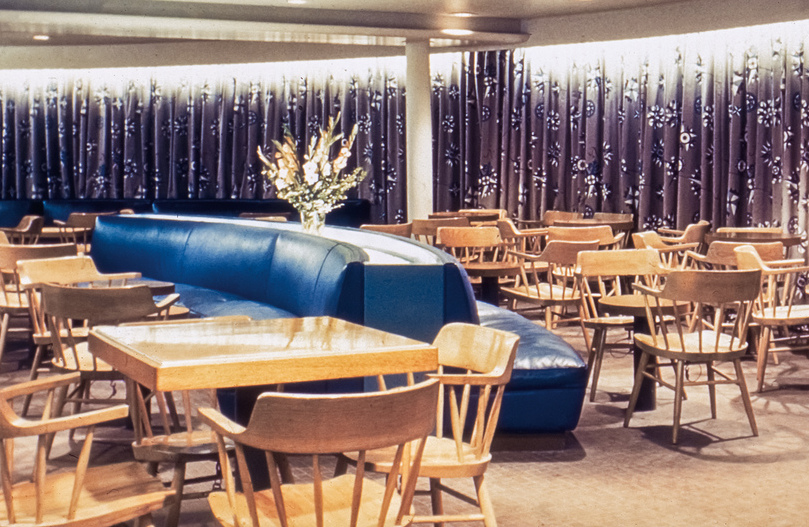 To contemporary eyes, the interiors of the two ocean liners may seem underwhelming, especially in contrast to the grand and luxurious European liners of the mid-twentieth century (fig. 2). The public rooms of the AEL ships more closely resembled the living rooms of a typical American suburban family. They were single-story, low-ceilinged spaces filled with unassuming contemporary furniture. Knotty pine veneer, linoleum, and Formica, so beloved within the mid-century aesthetic, abounded across all passenger spaces. Against this backdrop, antique objects and fine art stood out as major decorative features, not only connecting each ship to its historic predecessor, but also appealing to the growing appreciation for folk art and Americana both in the popular lexicon of design as well as in scholarly research.