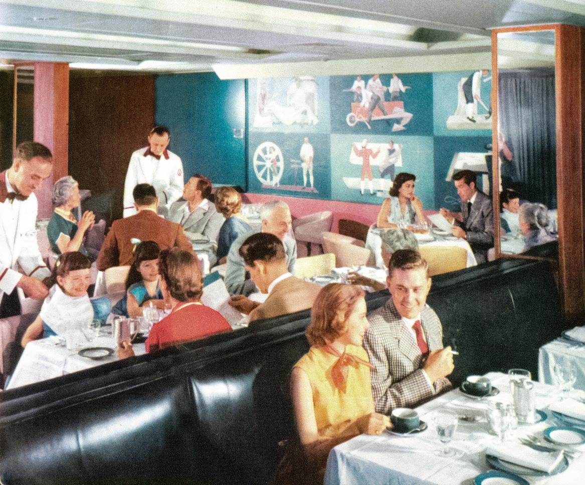 Happily, the entire correspondence between Refregier, Dreyfuss’s office, and I. Stein and Sons, a marine furniture and fixtures company, survives in the Anton Refregier Papers at the Archives of American Art and shows that Dreyfuss personally negotiated with the artists and ultimately approved the final designs.40 The actual contracts and payments, however, were handled by I. Stein and Sons, which manufactured all of the ships’ furnishings based on Dreyfuss’s designs and installed all the interiors and artwork.41 Refregier’s commission is especially significant, as he was embroiled in ongoing controversy over his epic mural series History of San Francisco, which would culminate in Congressional hearings spearheaded by California Congressmen Hubert Scudder and Richard Nixon.42 Publicity materials for the liners made no mention of the ongoing political furor, and Refregier’s murals were featured as a major artistic highlight of the ship’s interiors. Nothing in the preserved correspondence indicates there was any consideration of dropping Refregier from the project. This appears to be in keeping with Dreyfuss’s practice of hiring artists who were in the public eye, with any attendant controversy largely disregarded. Three years previously, he had commissioned a set of four identical murals depicting maps of the Mediterranean for the AEL’s “Four Aces” from Miné Okubo, best known for her 1946 graphic memoir Citizen 13660, depicting the internment of Japanese-Americans during World War II.43