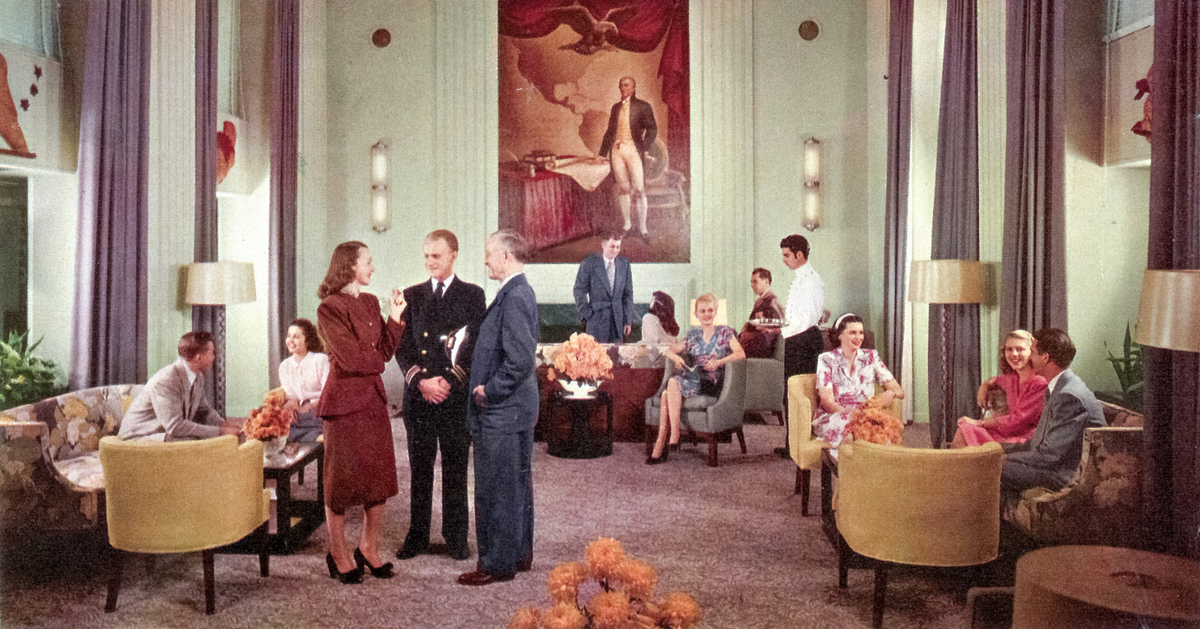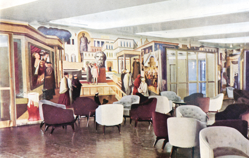 AEL budgeted a generous sum of $106,930—approximately $1,376,895 per vessel in 2024 dollars—for each ship’s art.5 The purchases fell into one of three categories: authentic antiques borrowed or acquired for display; commissioned reproductions; and contemporary art commissions. Dreyfuss, working alongside his team, personally chose all works of art, visiting numerous galleries and studios to select a variety of critically acclaimed artists and emerging talent. He was careful, however, to avoid the extremes of modernity while also eschewing clichés of tradition.6 He negotiated commissions from late 1949 into the early 1950s, and the works were approved and installed in 1951 shortly before the Independence’s maiden voyage in February, and the Constitution’s in July. The interior decor, and even much of the art found on board, was identical across both ships, with the exception of a few antique pieces and specific items relating to the name and historic precedents of each vessel. As the first ship of the pair, the Independence was the better-documented liner, and most surviving interior photographs are of that vessel. However, the Constitution received greater publicity during its career thanks to the ship’s numerous appearances on television and film, including enthusiastic press coverage of Grace Kelly’s 1956 crossing to marry Prince Rainier of Monaco.